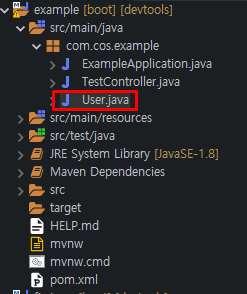 조금 더 활용해보기 위해 STS툴에서 com.cos.example패키지에 User class를 하나 생성해줍니다.