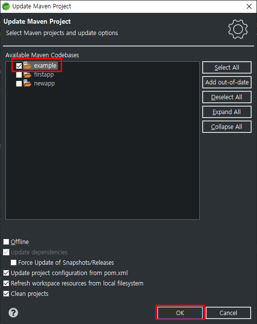 업데이트 할 프로젝트를 선택하고 OK 눌러줍니다.