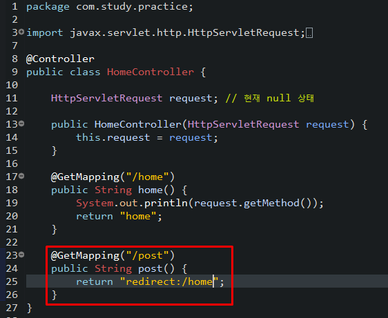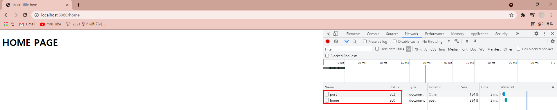 브라우저에서 localhost:8080/post로 접근하더라도 localhost:8080/home을 요청하게 됩니다.