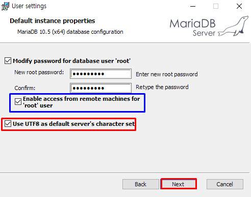 파란 상자의 내용은 외부에서도 데이터베이스 접근을 허용하는 것입니다. 실무에서는 거의 체크하지 않습니다.