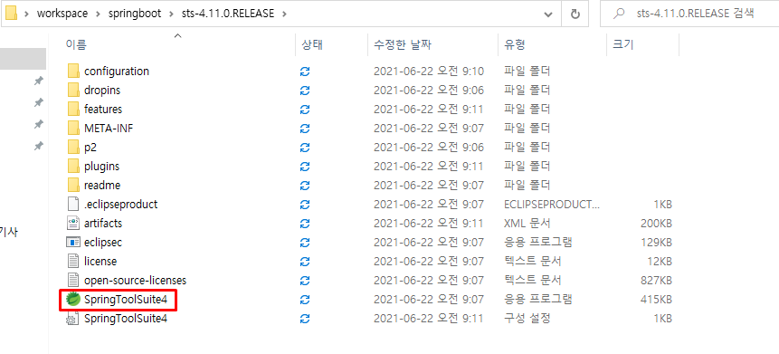 실행이 완료되면 sts-4.11.0RELEASE 라는 폴더가 생깁니다.