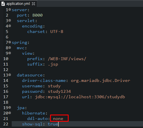 application.yml 파일로 가서 ddl-auto 값을 none으로 해줍니다. create로 한다면 테이블이 서버가 실행될 때마다 다시 생성되기 때문에 none으로 해줌으로써 다른 변화를 주지 않도록 해줍니다.