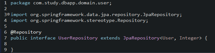 DAO 역할을 해주는 UserRepository라는 이름의 Interface를 하나 생성해줍니다.