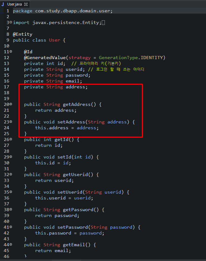 회원가입을 할 때 주소도 받도록 하기 위해서 User 클래스에서 address 피드를 추가합니다.