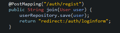 회원가입 기능을 할 메서드를 만들고 return 값을 로그인 페이지로 해줍니다.