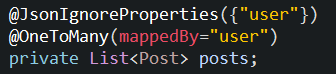 @JsonIgnoreProperties annotation({"user"}) 를 하면 post 테이블에 있는 user는 조인 시 파싱하지 말라는 뜻이 됩니다.