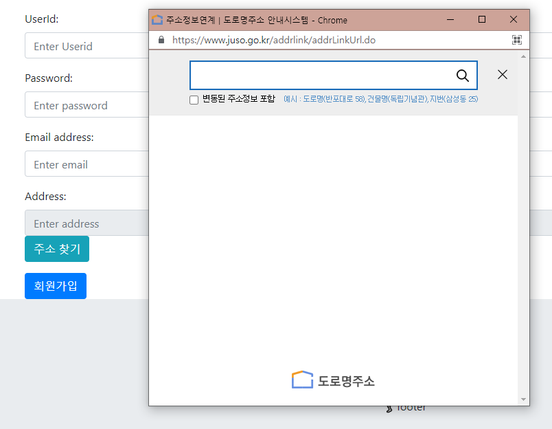 주소 API를 가지고 회원가입 기능 중 주소 검색을 만들어보았습니다.