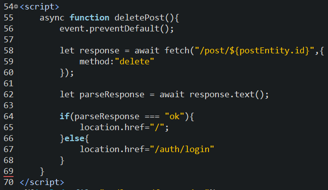 fetch를 사용해서 controller에서 사용한 매핑 주소를 입력해주고, HTTP method를 입력해줍니다. 삭제를 할 것이기때문에 delete를 사용해줍니다.