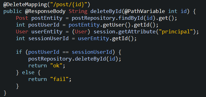 권한 체크를 하기 위해 게시글의 쓴 사용자의 ID, 로그인 되어있는 사용자의 ID가 같은지 확인 후 같으면 해당 게시글을 삭제하고 "ok"를 return 해주는 코드를 작성합니다.