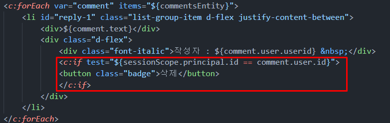 로그인된 세션의 아이디와 댓글을 작성한 사용자의 아이디가 같을 때 삭제 버튼을 보이게 해줍니다.