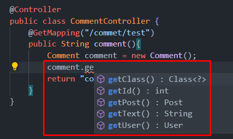 컨트롤러에서 테스트로 확인해보면 getId 등의 생성한 컬럼의 get 함수가 인식되는 것을 볼 수 있습니다.