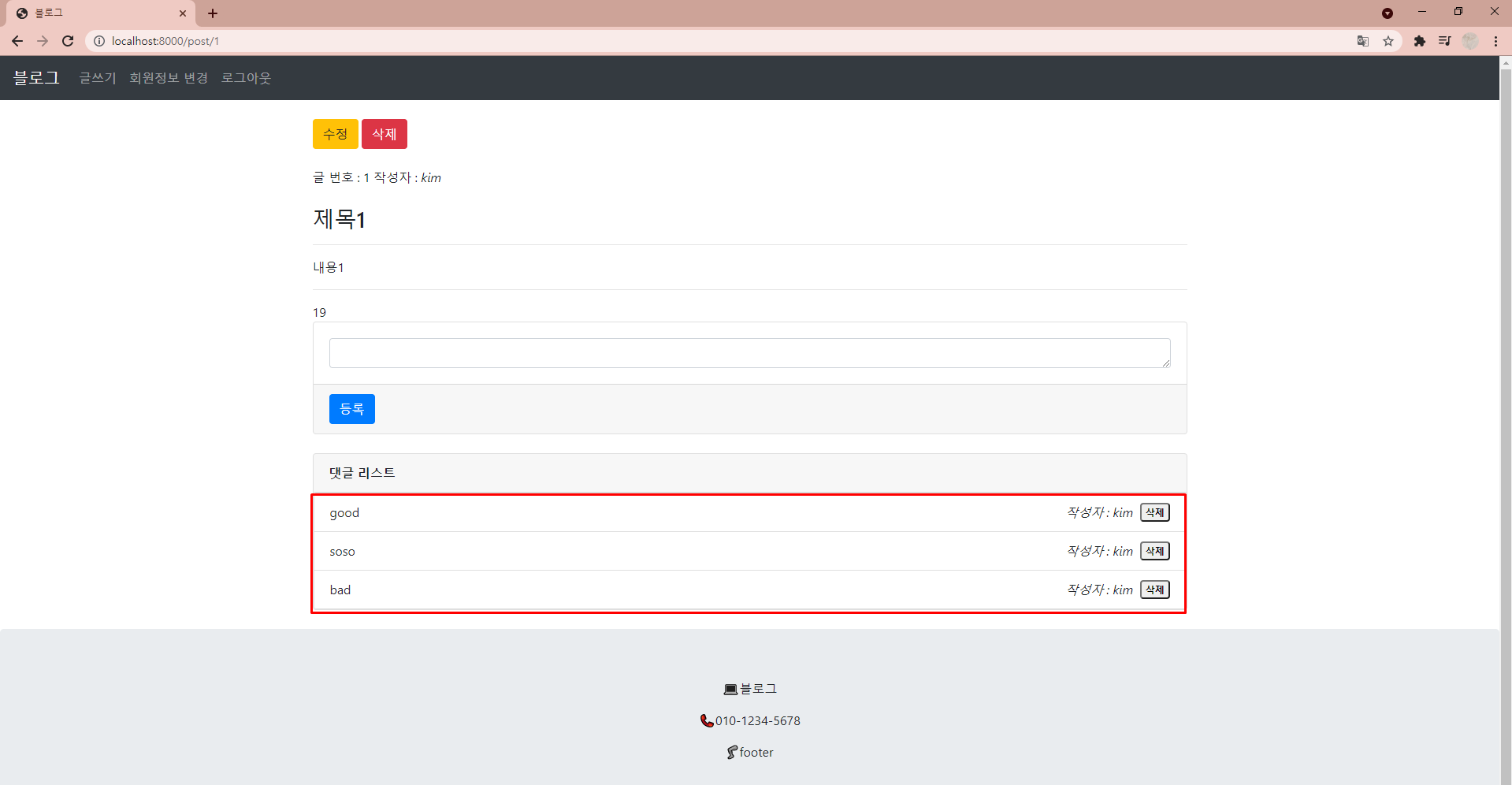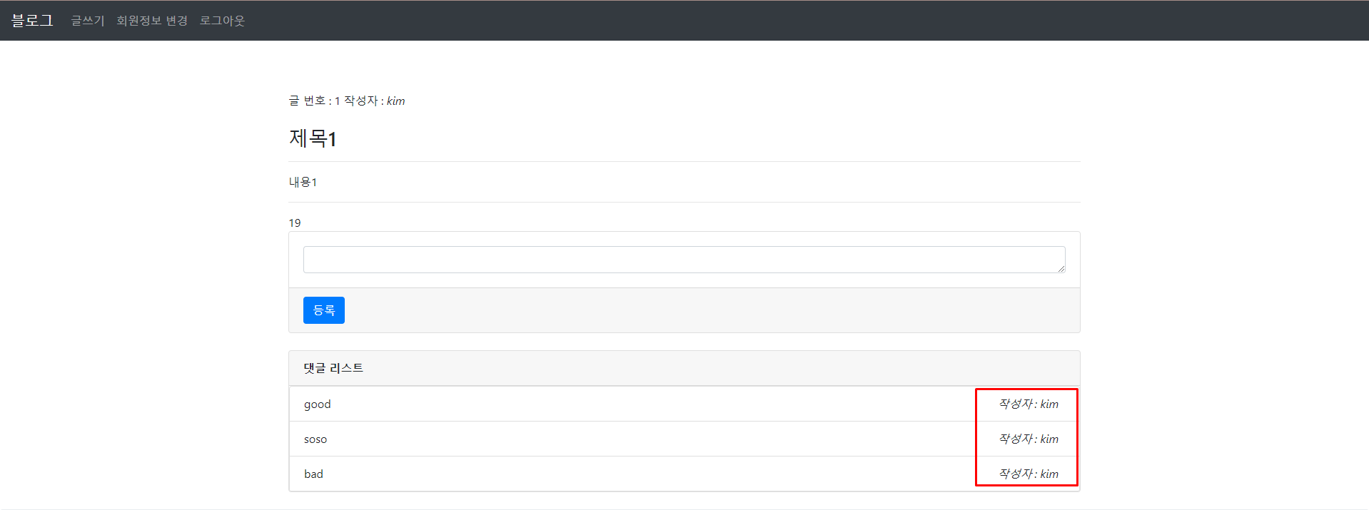 yml파일의 DB를 create해서 생성한 것이기때문에 기존에 회원가입해놨던 데이터들이 날라갔으므로 다시 회원가입과 글쓰기를 통해서 댓글쓰기 페이지가 보이도록 해줍니다.
