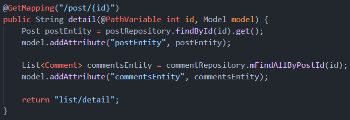 해당 게시글에 작성된 댓글들만 보여야하므로 post_id로 comment 데이터를 가져와 List 컬랙션에 넣고 모델에 올려줍니다.