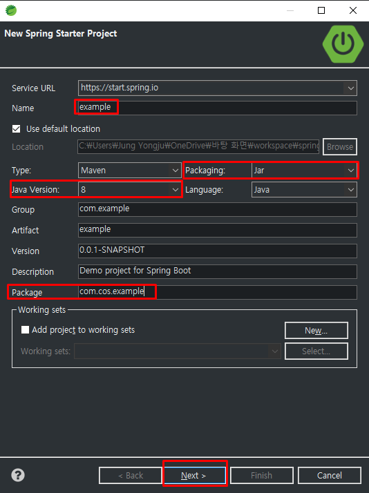 이름을 정하고, Packaging - jar, Java Version - 8, Package - 알맞게 설정하여 Next 눌러줍니다.
